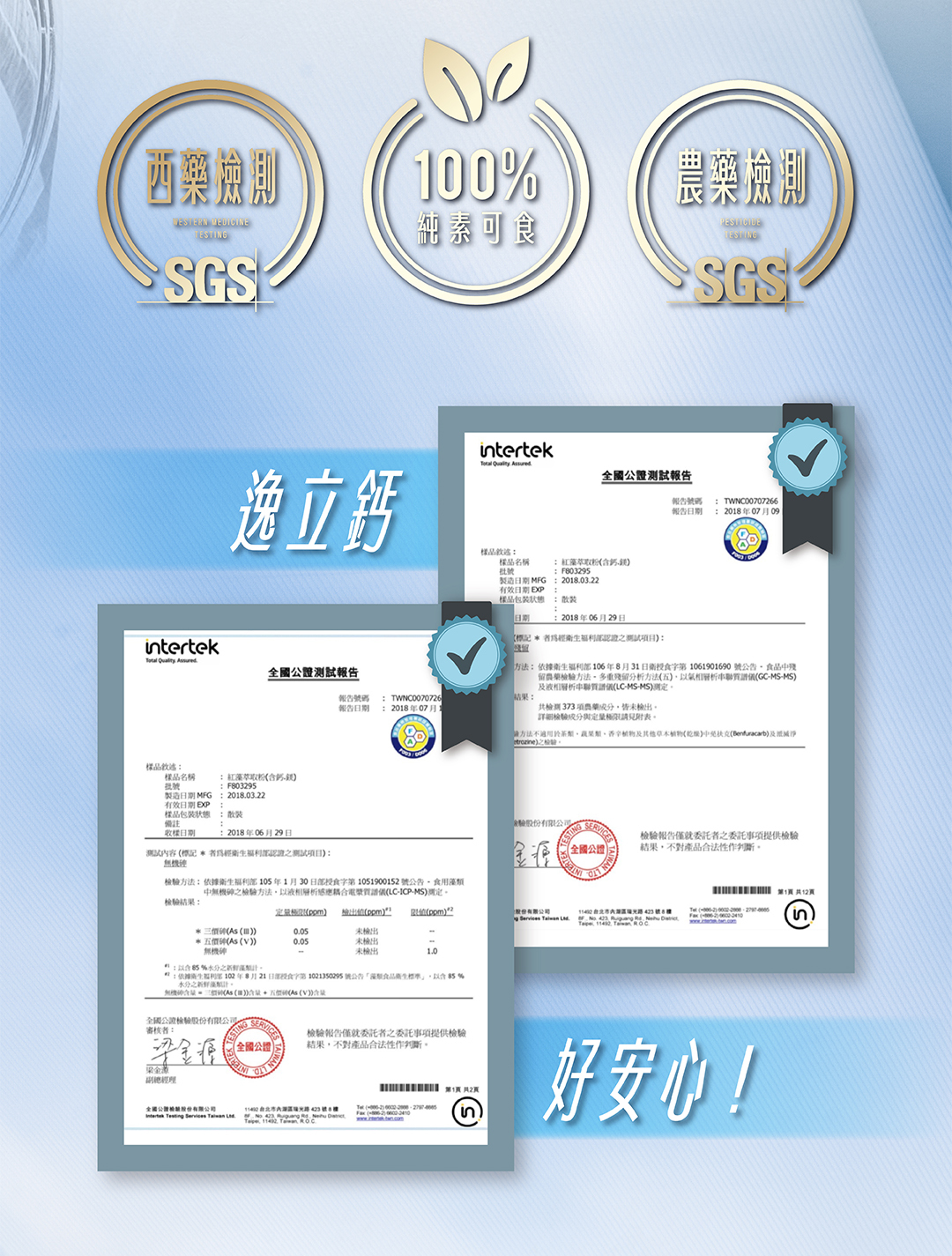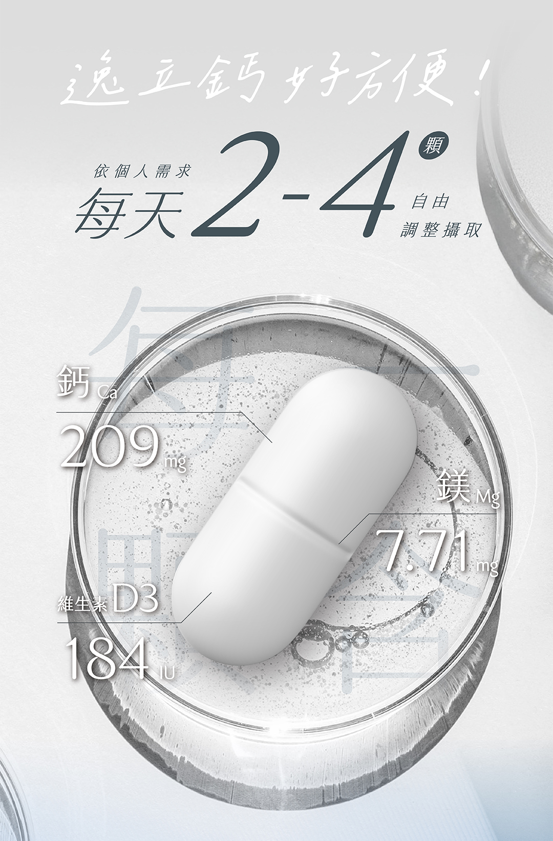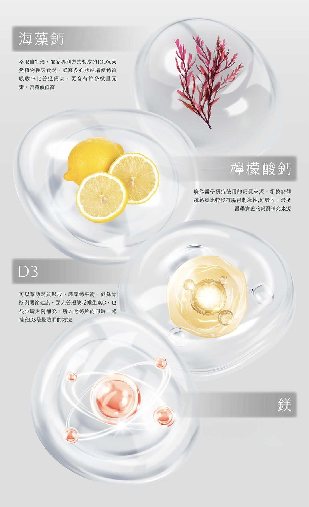 逸立鈣為優質的海藻鈣萃取+ 檸檬酸鈣+ 鎂+ 維他命D3